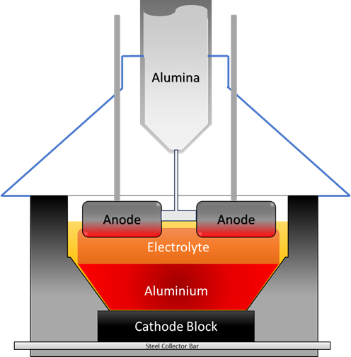 Fig 1: Hall–Héroult cell schematic illustrating AlF₃ influence on bath temperature.